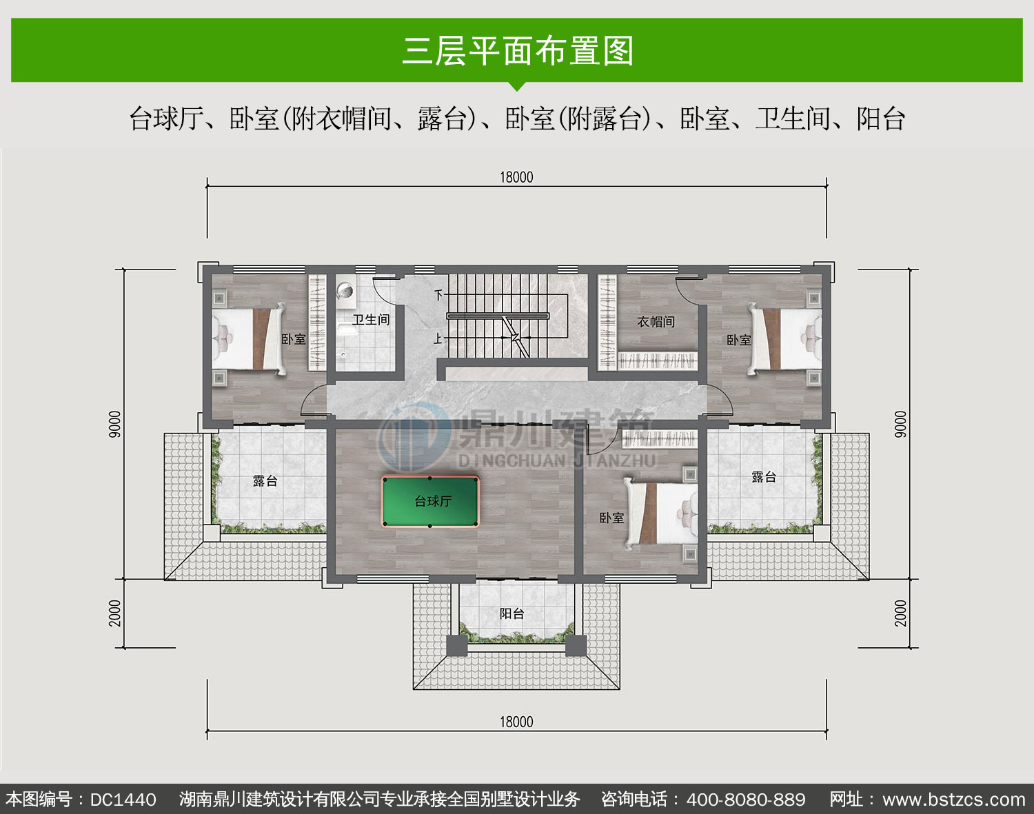 | 三 層: | 臺球廳、臥室(附衣帽間、露臺)、臥室(附露臺)、臥室、衛生間、陽臺 | |||
