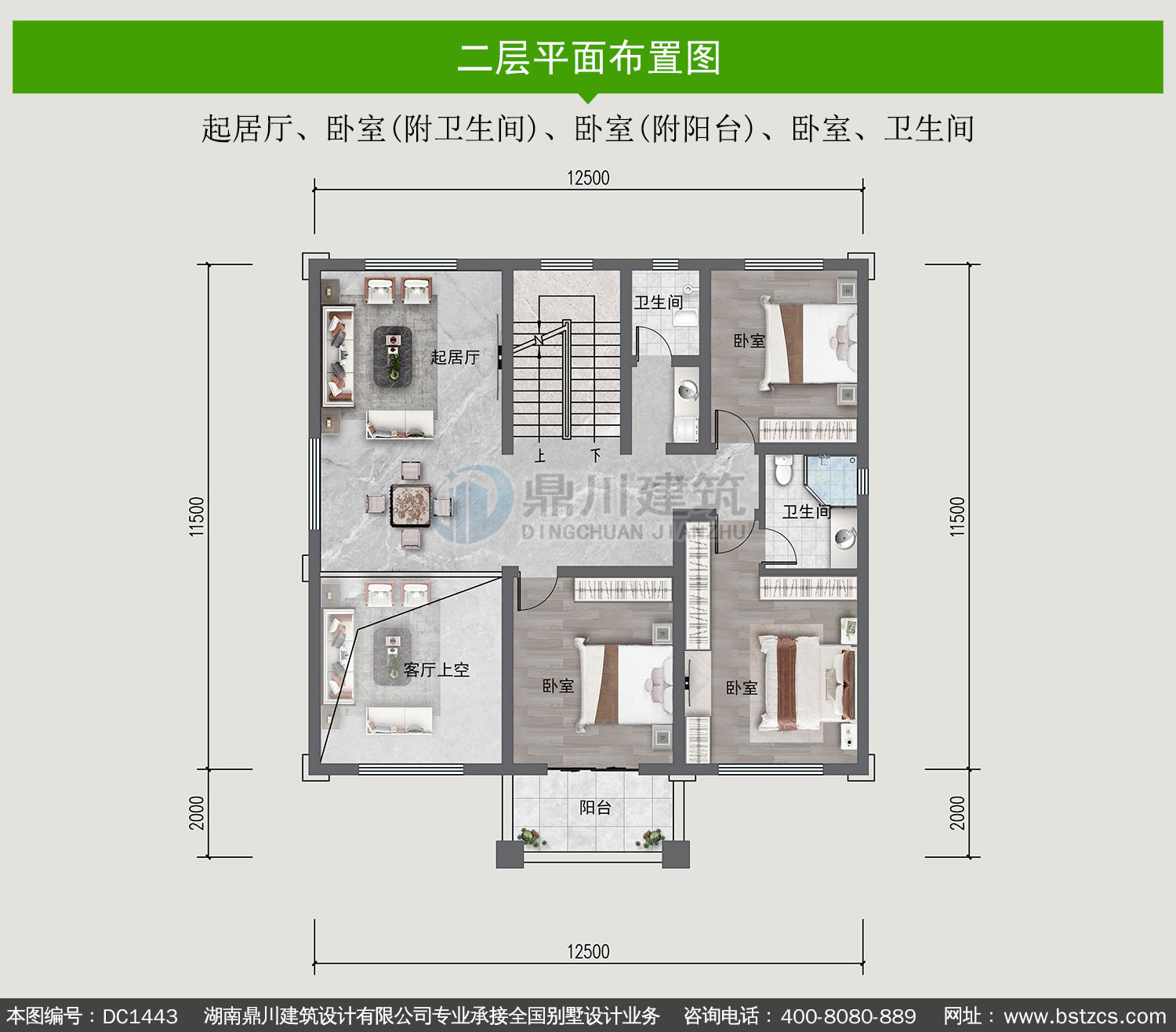 | 二 層: | 起居廳、臥室(附衛生間)、臥室(附陽臺)、臥室、衛生間 | |||