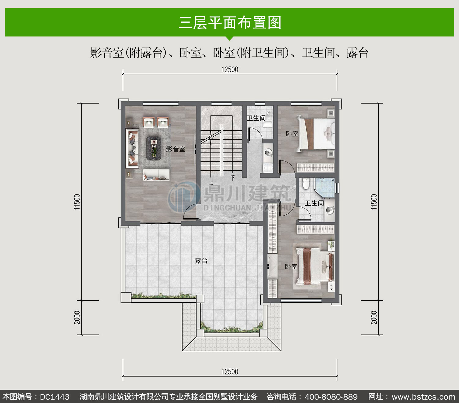 | 三 層: | 影音室(附露臺)、臥室、臥室(附衛生間)、衛生間、露臺 | |||