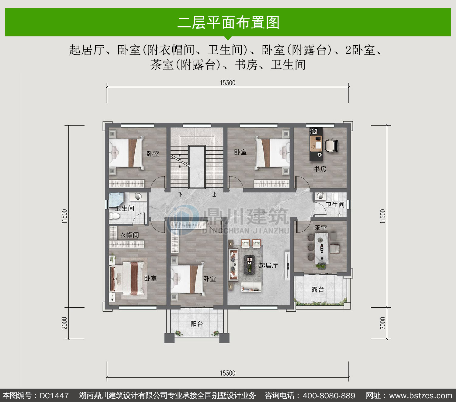 | 二 層: | 起居廳、臥室(附衣帽間、衛(wèi)生間)、臥室(附露臺)、2臥室、茶室(附露臺)、書房、衛(wèi)生間 | |||